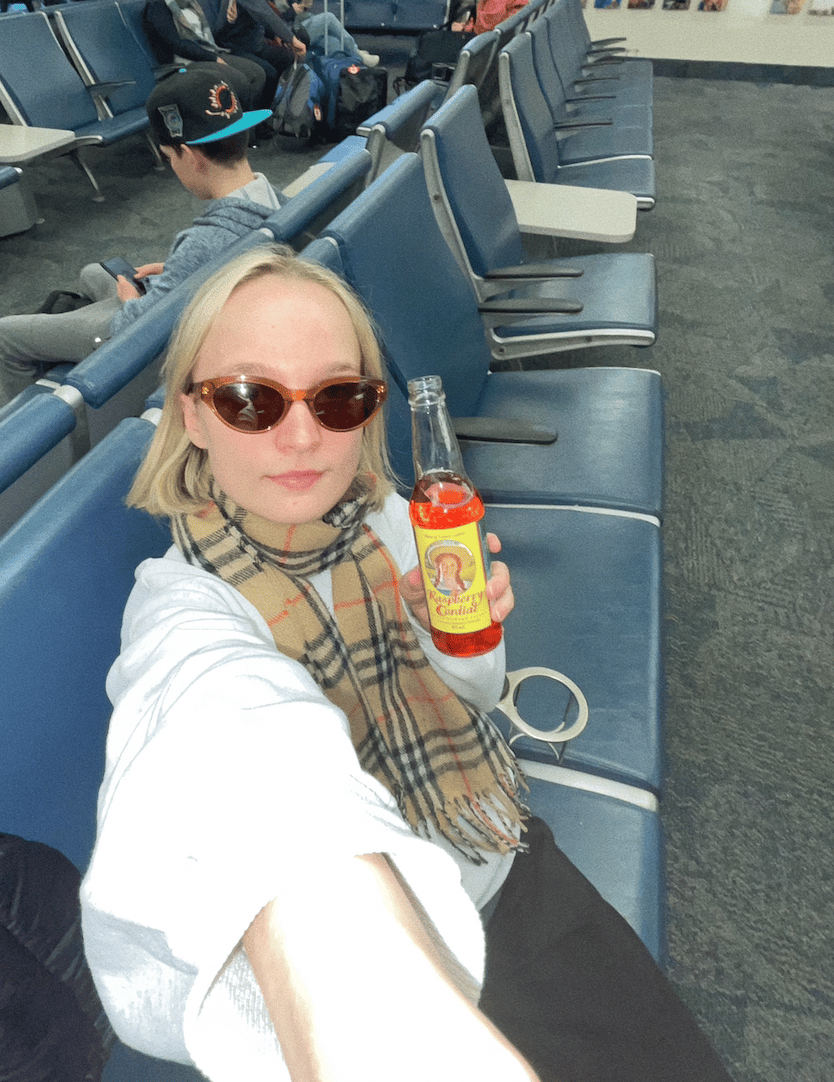 me, drinking raspberry cordial at the prince edward island airport in honour of anne (you might know her from green gables?)