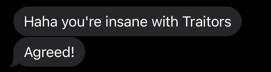 My friend shaming me for my Traitors obsession.
